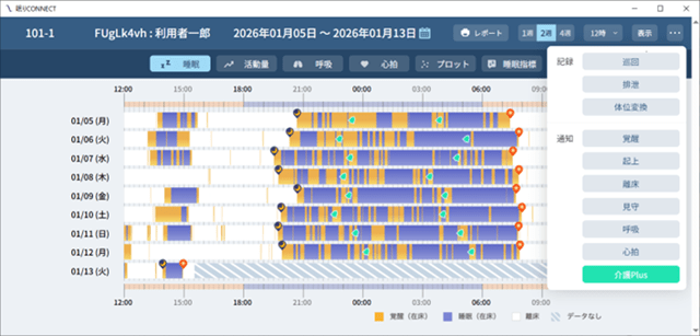 本連携により、「眠りCONNECT」が体動センサから取得する利用者の睡眠状態と、「介護Plus」が「おむつナビ」から記録する排泄情報(尿とりパッドへの尿の吸収状態)を一画面で確認できるようになり、介護現場でのきめ細かなケアや業務効率化に貢献します。