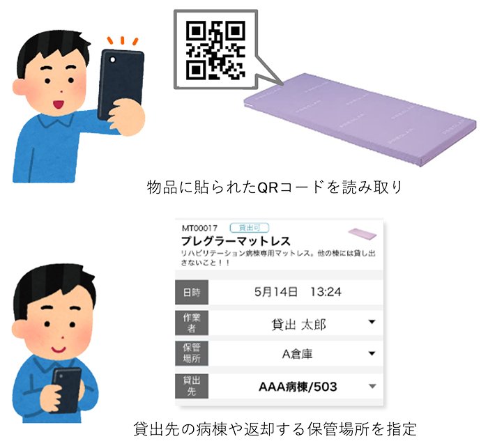 パラテクノ社は「monokanri」というスマートフォンのアプリで、物品管理を行っている。一つひとつのマットレスに識別番号とQRコードを付与し、アプリで読み込むと、いつ、どの病棟に、どのマットレスを貸し出し/返却したのかが分かるようになっている。自動ですべての履歴が残り、マットレスに関する情報を正確に管理できる。