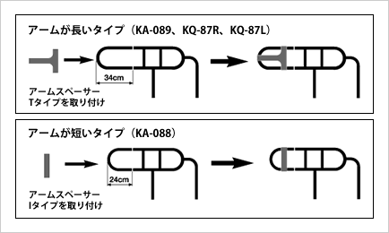 アームスペーサーの取り付け対象となるスイングアーム介助バーには、アームの長いタイプと短いタイプがあります。下記の適合する組み合わせでご使用ください。
