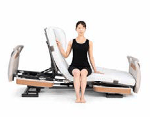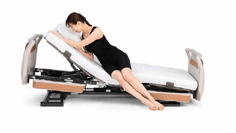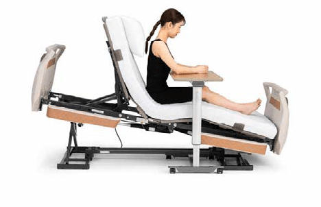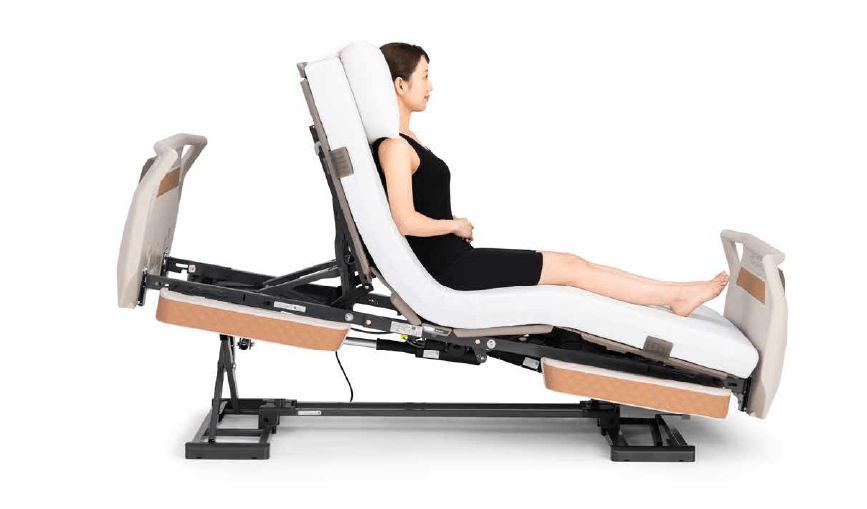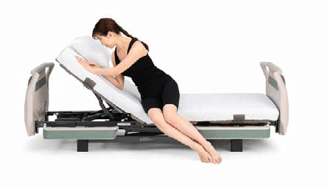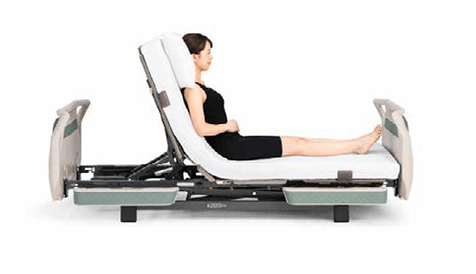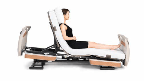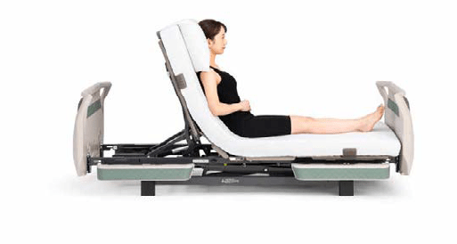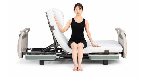 背と膝の動きに合わせてベッドが傾斜する背あげです。背あげ時に体圧を仙骨部から、お尻と太ももに再分配するため、床ずれリスクにも配慮しています。