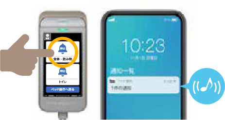 ご本人様と介護する方がつながる、家庭内呼び出し機能を搭載。手元スイッチの呼び出しボタンを押すと、ご家族のスマートフォンに通知します。