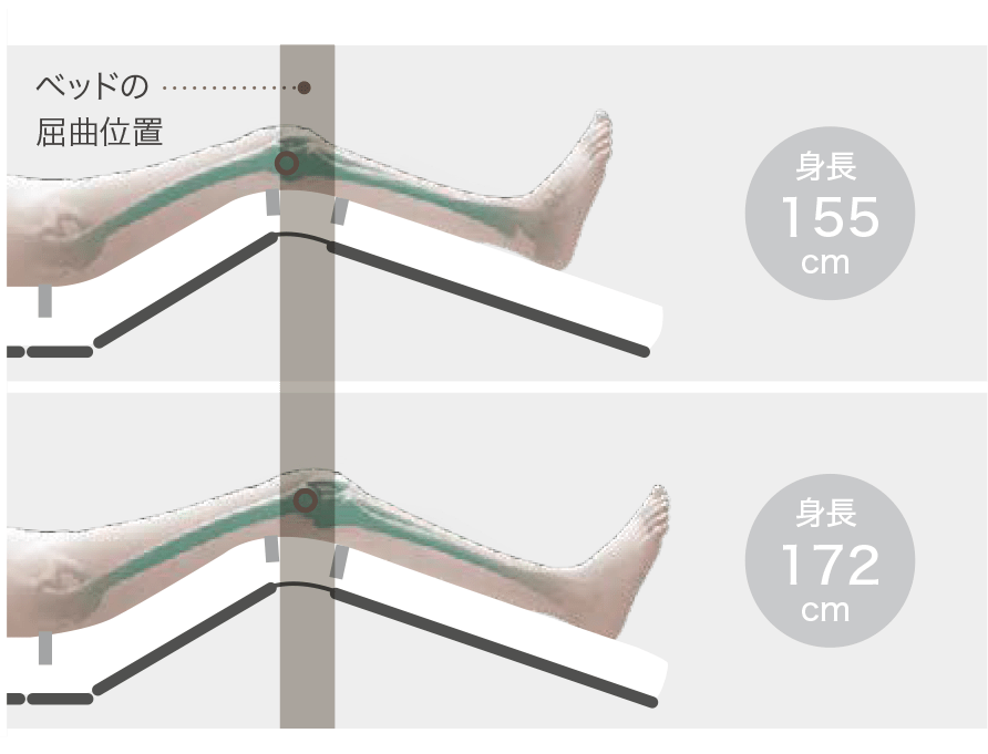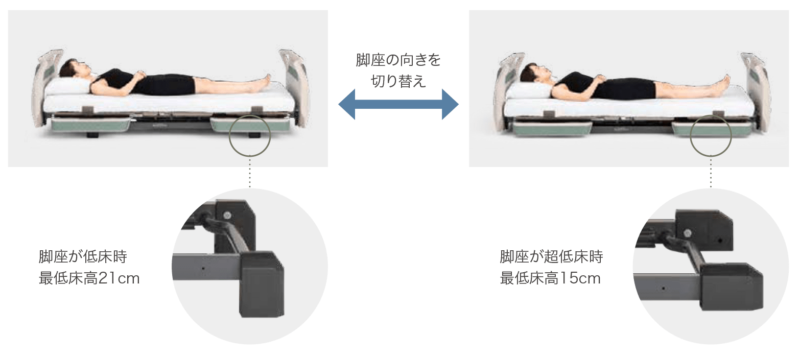 ベッドを最大64.5cm*まで高くできるため、身長が高い方も腰に負担が かかりにくい姿勢で介護できます。また、Hタイプでは最低床高が21cm、 Xタイプでは脚座の取り付ける向きを変えることで、最低床高15cmの超 低床ベッドに切り替えられます。初めてふとんからベッドに移行される方 や、ベッドから転落する心配のある方にも配慮しています。 *ゆかからボトム上面までの高さ(マットレスの厚みは含みません)。Xタイプの脚座を超低床位置に取り付けた場合は、最大58.5cmまで高くできます。なお、脚座を付け替えることで最低床高を2段階に調整することは可能です。