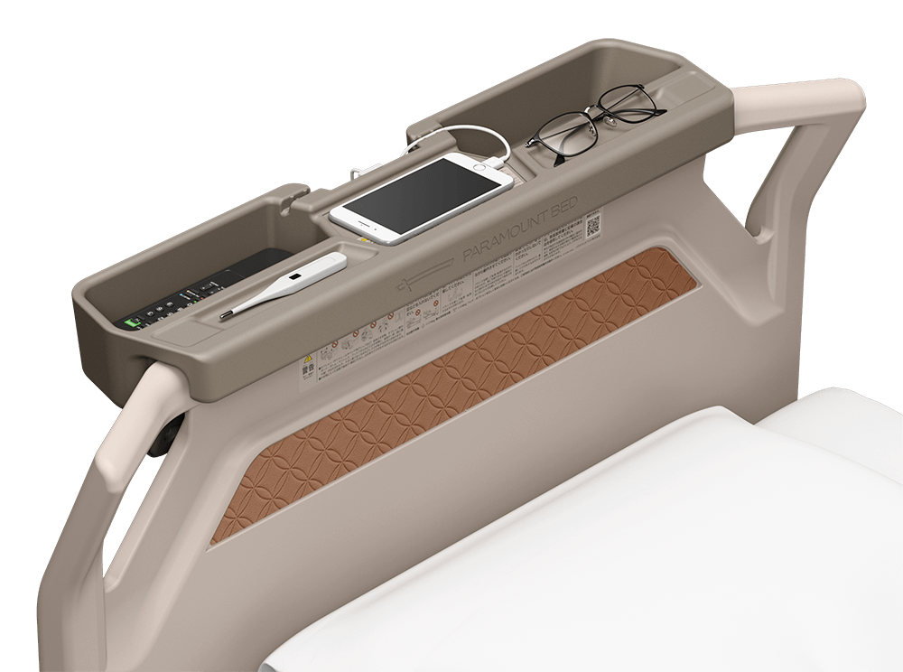 スマートフォンやメガネ、リモコンなどが置ける棚を追加できます。スマートフォンの充電などに使える電源コンセントも2口設けており、頭側・足側のボードいずれにも取り付けられます。
