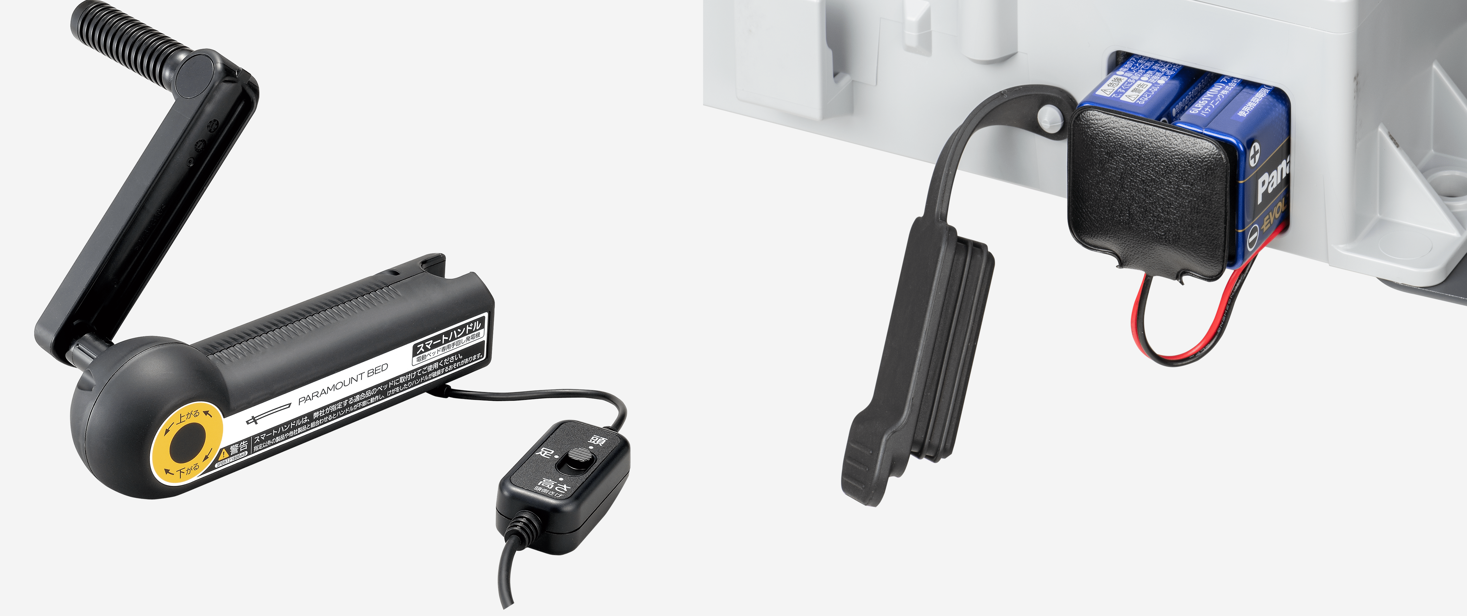 災害などによる停電時や緊急時に、ハンドル操作でベッドポジションを調節できるスマートハンドルを用意しています。スマートハンドルをお持ちでない方は、乾電池によりベッドをフラットの状態に戻すことができるようになりました。