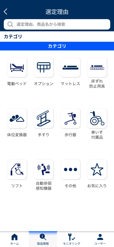 レンタルをお考えになっている福祉用具のアイコンを選ぶと、想定される選定理由を閲覧できます。