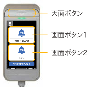 天面ボタンと2つの画面ボタンに、呼び出しメッセージとメロディを割り当てることができます。登録された呼び出しメッセージはベッド操作アプリに通知され、使用シーンに合わせた使い方ができます。