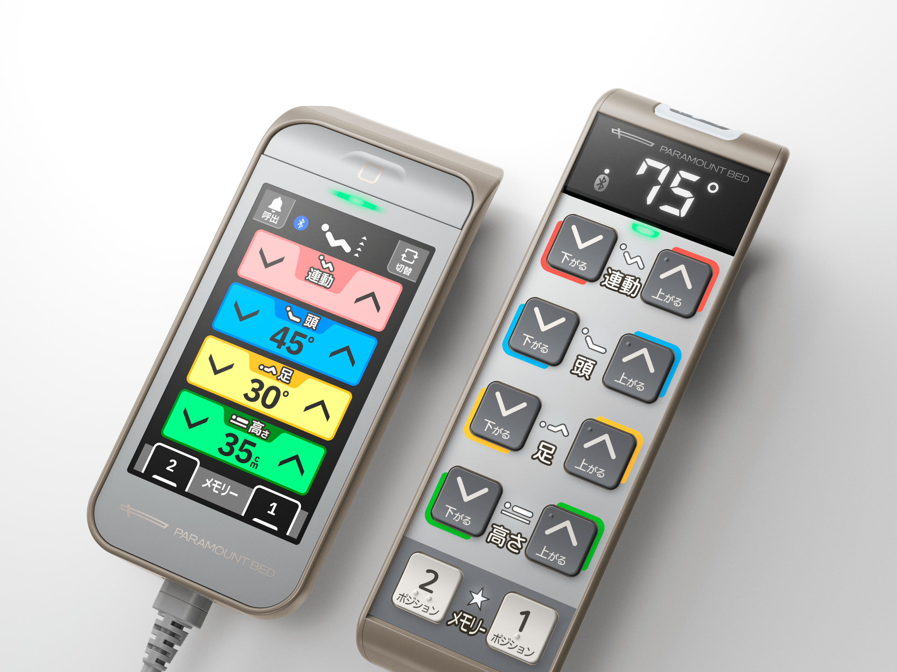 操作する内容ごとに色分けされた大型ボタンを採用。ボタンを押したときに電子音を発するなど、目と指と耳で確認できるように工夫しています。また、上部の呼び出しボタンを押すとベッド操作アプリに通知することができます。