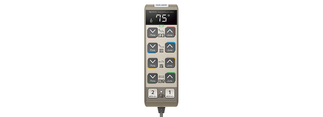 軽量・コンパクト、手に馴染みやすい形状で使いやすい手元スイッチです。操作内容ごとに色分けされたデザインを採用し、「上がる」「下がる」ボタンを指先でも識別できるように突起を設けています。さらに表示パネルには大きくはっきりとした文字でベッドの角度や高さを表示するなど、わかりやすく正確に操作できるように配慮しています。