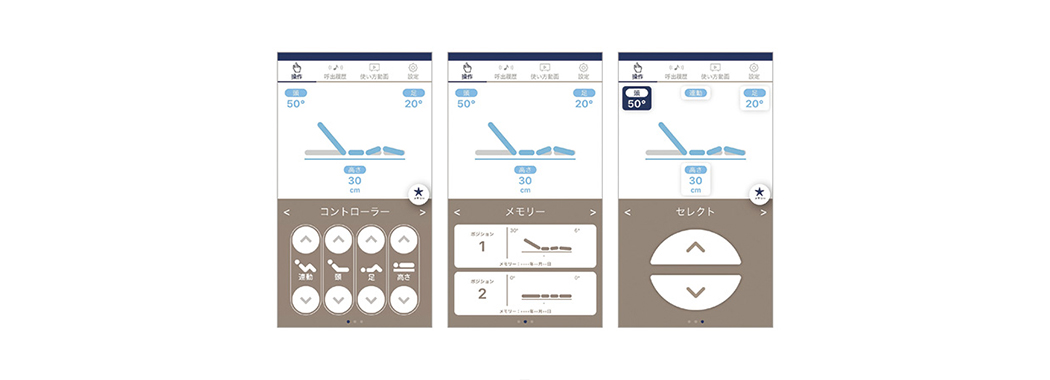 スマートフォンに「ベッド専用アプリ」をダウンロードして、スマートフォンをベッドに登録すれば、家庭内呼び出し機能、スマートフォンによるベッド操作などが利用できます。手元スイッチの呼び出しボタンを押すと、無線(Bluetooth)の届く範囲にあるベッドの登録されたスマートフォンに通知できます。ベッドに登録されたスマートフォンでは、手元スイッチと同じようにベッドを操作できます。操作画面は、使い方に合わせてボタンの大きさなどが異なる3種類が選べます。スマートフォンを活用して接触頻度の高い手元スイッチを共有しないようにするなど、衛生面に配慮した使い方も可能です。また、「ベッド操作アプリ」ではベッドの使い方を閲覧できます。手元スイッチのボタンごとにひとつづつ動画で説明しているので、初めてベッドをお使いになる方にも理解しやすくなります。