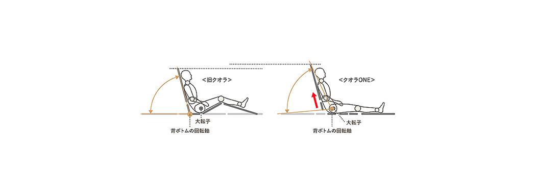 単に背ボトムを起こすのではなくやや伸びあがるように起こすことで背ボトムと体の回転軸が近くなり、背あげによる圧迫感や体のズレを軽減します。