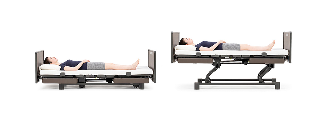 もっとも低い状態でベッドの高さ(ゆかからボトム上面までの高さ)が25cmとなる低床設計です。端座位をとったときに、背に低い方でもかかとまでゆかにつけやすくなり、万一ベッドから転落したときの衝撃を軽減できます。また、ベッドの高さをさげるときに足や周辺の物品を挟まないように、ボトムの高さが32cmになるとブザーを鳴らして一旦停止します。ボタンを押しなおすと、ブザーを繰り返し鳴らしながら最低位(25cm)まで通常よりもゆっくりとさがります。