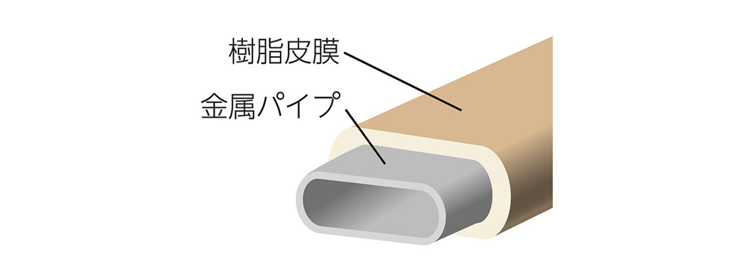 手すりの形状は握りやすいだけでなく、握れない方でも体重をかけやすいように配慮した楕円状の形状として、上端・下端の両方に水平部分を設けることで身体を預けやすいように工夫されています。表面には滑りにくく、熱くなりすぎず冷たくなりすぎないように樹脂皮膜でコーティングが施されています。