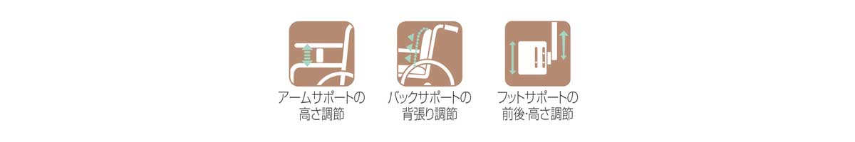 アームサポートの高さ調節ができます。姿勢を安定させるため両肘の高さを適切な位置に合わせます。シートにクッションを併用する場合など座面の高さに合わせて調節します。