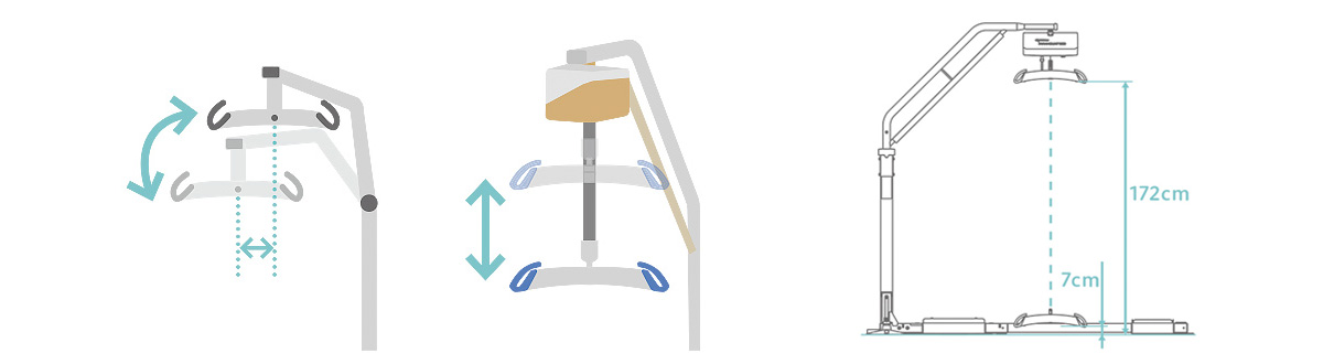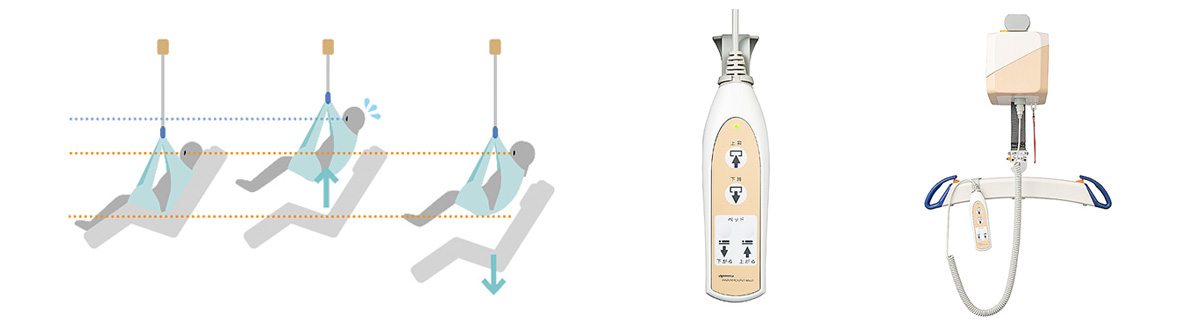 吊り上げるときに利用者様の身体の動きが少ない垂直昇降方式を採用しています。また、昇降ユニットを動かさずにハンガーだけをあげさげする方式とし、利用者様に威圧感を与えず作業の邪魔になりにくいように配慮しています。
