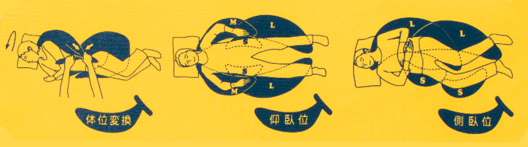 身体のラインに沿った使いやすい形状のクッションで、S・M・Lの3サイズをご用意しています。両端には持ちやすいグリップを設けてあるので、広くやわらかい面を身体に当てて皮膚への負担軽減に配慮した体位変換がおこなえます。体位変換後は、そのまま姿勢保持に利用できます。