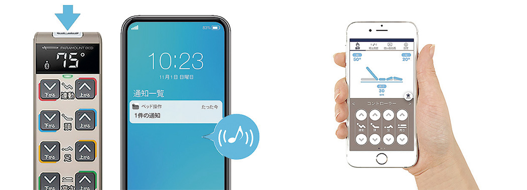 スマートフォンに「ベッド専用アプリ」をダウンロードして、スマートフォンをベッドに登録すれば、家庭内呼び出し機能、スマートフォンによるベッド操作などが利用できます。手元スイッチからスマートフォンへの呼び出しも可能です。音声操作や外部の操作スイッチとの連携など、指先でのボタン操作が難しい方にも配慮しています。