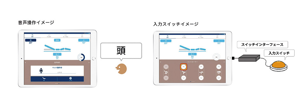 指先でボタン操作が難しい方でも、あらかじめ登録した言葉を順番に話すことでベッドの操作ができる機能と、身体が不自由な方の身体機能に対応した外部の操作スイッチ(入力スイッチ)と連携できる機能を「ベッド操作アプリ(iOS/iPadOS端末用のみ)」に搭載しています。