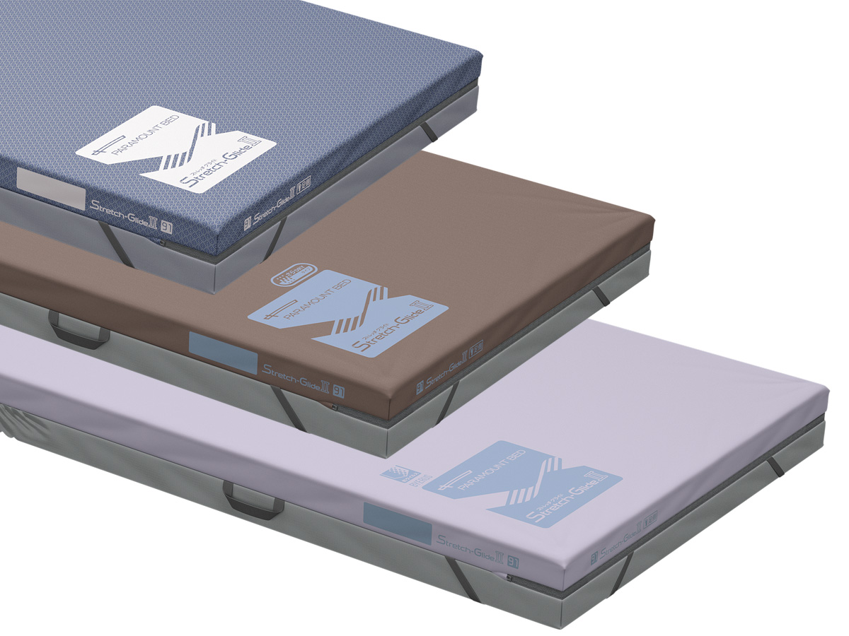 ウレタンフォームの上面に滑りのよいグライドシートを設けています。背あげをするときに、クッション材とカバーの間を滑らせて身体のずれや圧迫感を軽減します。シートは縦方向にだけ滑りやすくなっているため、横ずれしないよう配慮しています。また、臀部やマットレスの両端はグライドシート加工を除いており、背あげをするときや端座位をとるときに姿勢が安定しやすいよう配慮しています。