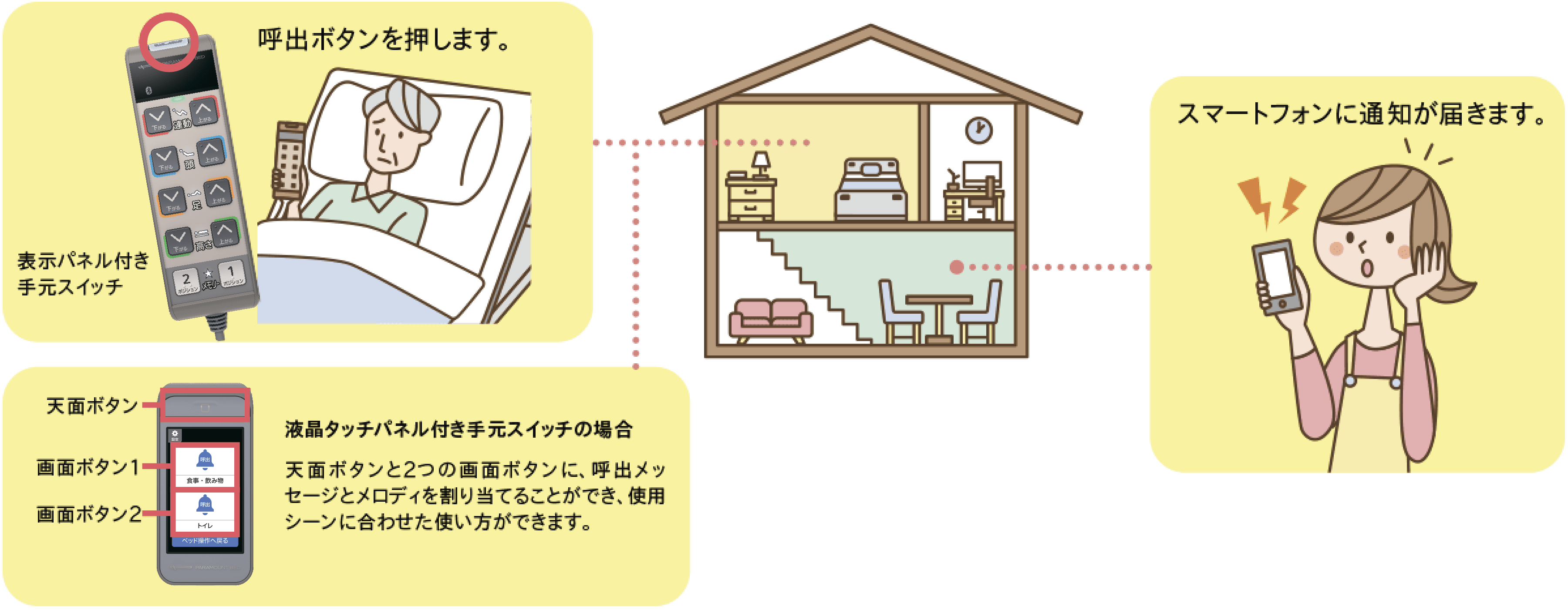 呼出通知機能は、ベッド使用者がご家族や介護者を呼び出すための補助的な機能です。本機能は無線通信を使用しているため、状況によっては呼出通知が正常に受信されない可能性があり、緊急時の通知を保証するものではありません。