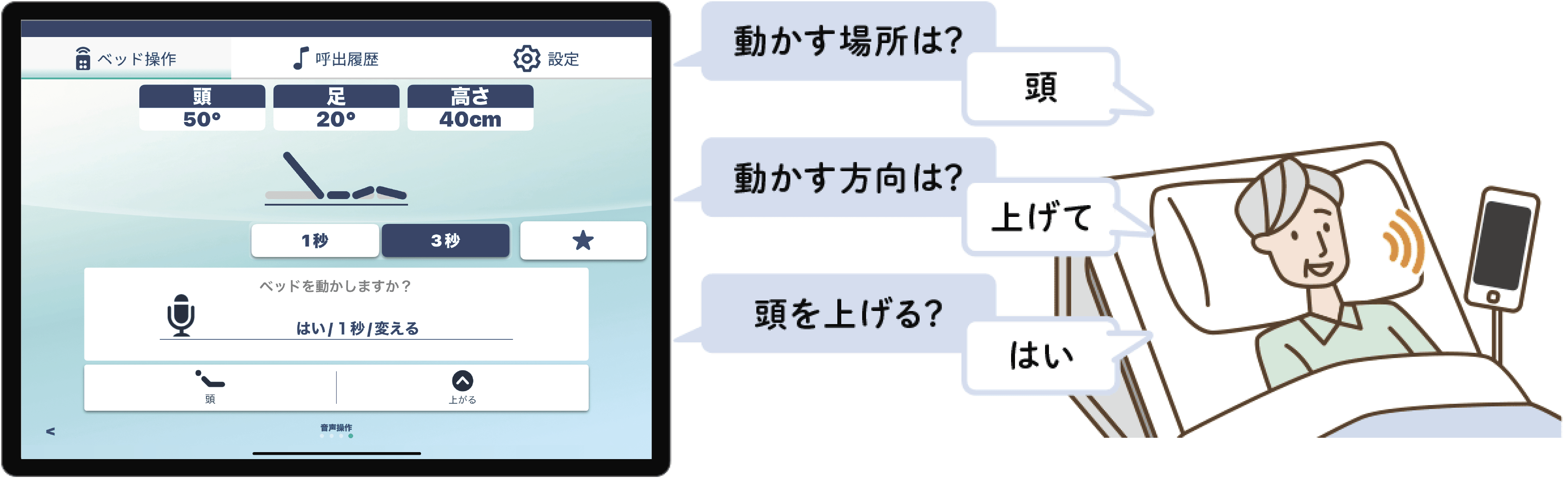 安全に少しずつベッドを動かすことができるよう、1回の操作でベッドが動く時間を設定できます(3秒、4秒など)。