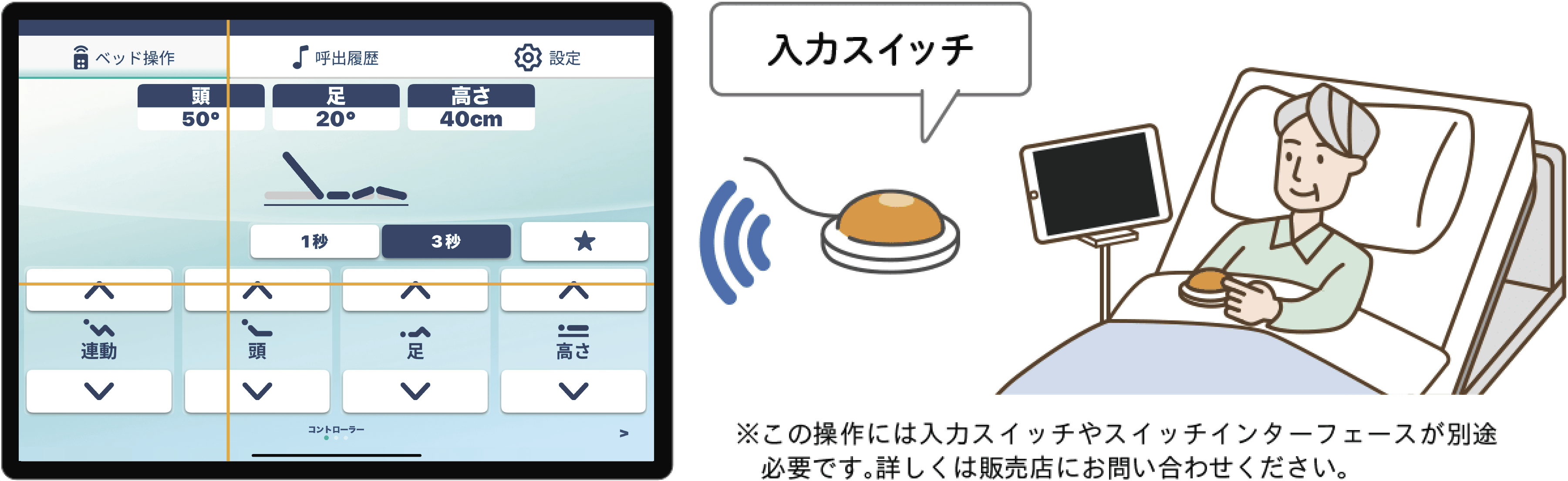 iOSの「スイッチコントロール」機能を利用し、接続した入力スイッチを操作してアプリ内のボタンを押すことでベッドを操作できます。