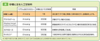 人工甘味料は化学的に作られた甘味料です。日本で主に食品に使われているものは「アスパルテーム」「アセスルファムリウム(アセスルファムK)」「スクラロース」です。アスパルテームの甘味度は砂糖の200倍、アセスルファムカリウムも200倍、スクラロースは600倍にもなります(表)。
