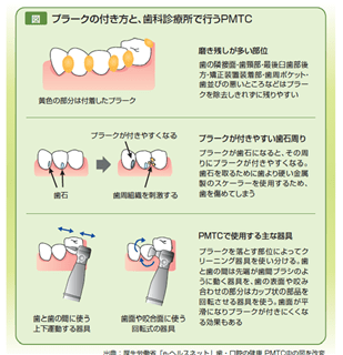 このとき、歯より硬い金属製の器具を使うので歯を傷めてしまいます。これを防ぐためには、スウェーデンで生まれたPMTCお薦めです。これは歯科医や歯科衛生士が歯より軟らかいプラスチックやラバーを使った器具で歯面を清掃する処置です。プラークが歯石になってしまうとこの器具では落とせないので、1、2カ月に1度の頻度で歯科診療所を受診するとよいでしょう。