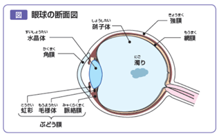 目の病気が原因で起こる飛蚊症もいくつかあります。多く見られるのが「ぶどう膜炎」が原因のものです。ぶどう膜は虹彩、毛様体、脈絡膜の総称です(図)。目に細菌などが感染したり、アレルギー反応などにより炎症が起こると、血管が多いぶどう膜から炎症細胞などが硝子体に入り込んで濁り、飛蚊症を起こします。「ぶどう膜炎の主な症状は目のかすみや視力低下ですが、炎症が強くなると飛蚊症で見える浮遊物が増加します」と鴨居先生。