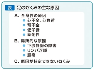 藤城先生は「足のむくみが起こる原因には、全身性の原因と局所性の原因があります(表)。全身性の原因の場合には、心不全に代表されるように、全身の血液循環が悪くなって足にたまった余分な水分を心臓に戻せなくなっています。局所的な原因では下肢深部静脈血栓症などで、足の特定の部位で血流が悪くなって水分が戻せなくなります。両足に同じようにむくみがある場合は全身性の原が、左右の足で差がはっきりある場合には局所的な原因が考えられます」と言います。