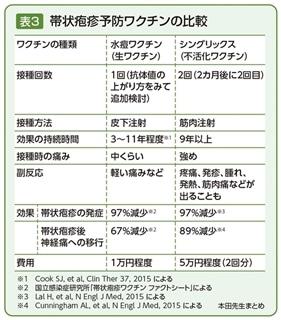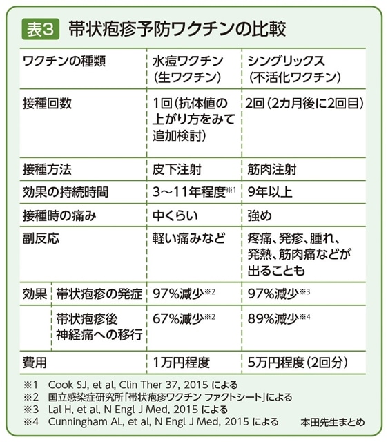 帯状疱疹の発症や、帯状疱疹後神経痛への移行を防ぐには予防ワクチンの接種が有効です。現在、帯状疱疹の予防ワクチンとしては、弱毒化した生ワクチン(水痘ワクチン)と、ウイルスの成分を利用した不活化ワクチン(商品名:シングリックス)の2種類があります(表3)。日本では50歳以上に接種が認められていますが、費用は基本自費です(補助が出る自治体もあります)。