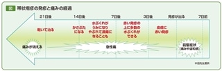 発疹と痛みの経過を示したのが図です。通常、早期に発見して治療を行えば10日ほどで治ります。発見が遅れ、自然治癒の経過をたどった場合でも、3週間ほどで症状は消えます。「高齢になると治るまでもう少し時間がかかります。修復能力の低下と加齢によって免疫力が落ちているためです」と本田先生。
