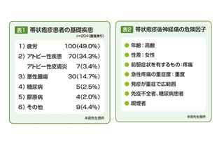 ストレスや病気がきっかけになる帯状疱疹ですが、それを引き起こす基礎疾患には様々なものがあります。表1に示したように、疲労をトップに、アトピー性疾患、悪性腫瘍、糖尿病などが並びます。