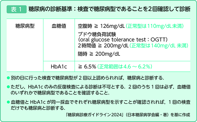 糖尿病の基本的な診断基準は、表1のように血糖値とHbA1c(ヘモグロビンエーワンシー)の値で明確に定められています。この他に、「糖尿病型(血糖値に限る)を1回確認+慢性高血糖状態の存在」の場合や、「過去に『糖尿病』と診断された証拠がある」場合も糖尿病と診断することになっています。櫻岡先生は、血糖値とHbA1cで判断する場合について、「それぞれの値が正常よりは高いけれど糖尿病の診断基準の値よりは下、いわゆる『糖尿病型ではない』という方がいます。『糖尿病予備群』、『糖尿病の境界型』と呼ばれる方たちです。主には、糖尿病の診断基準を満たしてはいないけれど食後の血糖値が高いといった方です。たとえば、HbA1cは6.5%未満なのに、ブドウ糖負荷試験や食後の血糖値が140g/dL以上の方は糖尿病予備群と言えます」と話します。