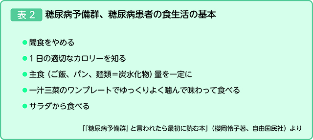 食事について櫻岡先生は、表2のような5つのポイントをアドバイスします。「食後血糖値が上がり、下がるまでに4時間ぐらいかかります。間食をしてしまうと血糖値が高い状態が続くことになりよくありません。次に自分にとっての1日の必要摂取カロリーを知り、それを一汁三菜(ご飯、汁物、おかず3品)の食事で取るように心がけてください。その際、重要なのはご飯やパンといった主食の量を一定化することです。また、食物繊維を多く含むサラダを最初に食べることで、食後の血糖値上昇を緩やかにすることができます」(櫻岡先生)。