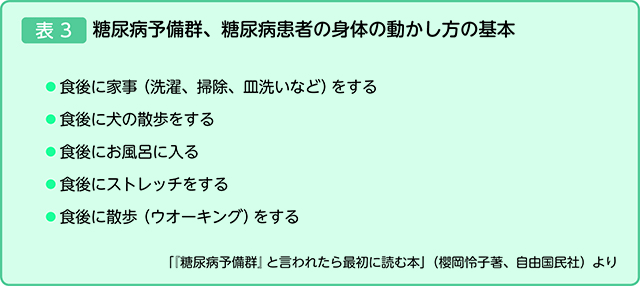 運動については表3のようなポイントを櫻岡先生はアドバイスします。「重要なのは、食後30〜40分後くらいの血糖値が上がった時に行うことです。食後に運動によって糖を消費することで、血糖値が下がっていきます。また、筋肉を使うことで、そこでの糖の消費も促されます。基本はウオーキングやジョギングといった有酸素運動で、これに筋肉に抵抗をかけるスクワットや、腕立て伏せ、ダンベル体操と行ったレジスタンス運動(筋肉に抵抗をかける動作を繰り返し行う運動)を組み合わせると理想的です。ウオーキングの目安は若い人で1日1万歩。それも1日おきで十分です」と櫻岡先生は話しています。