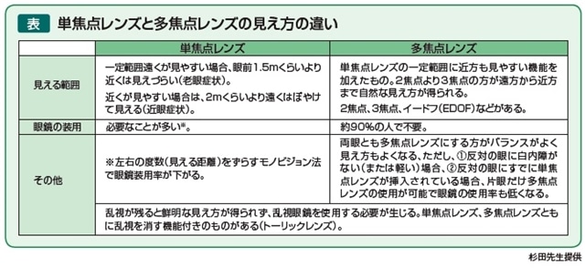 単焦点レンズか多焦点レンズかは、手術後の生活や費用面を勘案して決めます。杉田先生は「眼鏡をかけるのが苦にならない人は単焦点でいいと思います。眼鏡が嫌いという人には多焦点をお勧めします。眼鏡が嫌いだが単焦点がいいという人には右眼、左眼で遠方と近方の異なる単焦点レンズを入れる『モノビジョン法』という方法もあります。見え方が左右で違って大丈夫か?と思われそうですが、脳がうまく見たいものの距離に応じて見やすい方に切り替えるので、裸眼生活も可能です。眼科の先生に相談してみて下さい」と話します。
