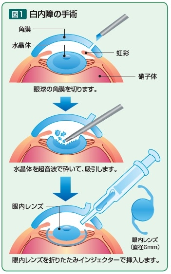 白内障手術は、濁った水晶体を取り除きその代わりとなる人工の眼内レンズを挿入する手術です。手術法もこの数十年の間に格段に進歩しました。現在行われているのは超音波水晶体乳化吸引術という手術です(図1)。
