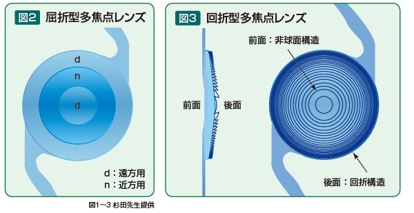 最初に眼科治療で使われるようになった2000年代初頭は、レンズ表面が同心円状に遠方と近方に焦点が分かれた「屈折型」が使われました(図2)。ただ、瞳孔が大きくならない高齢者は中心部の遠方しか焦点が合わないなど、問題点もありました。
