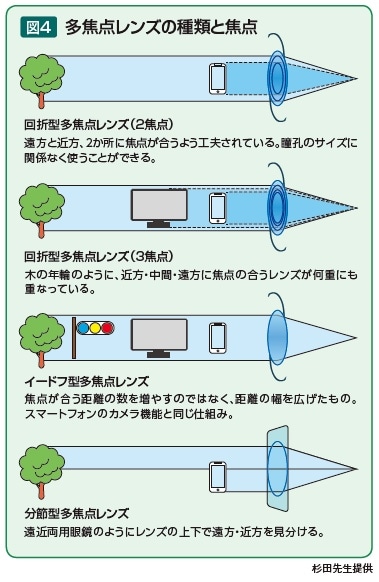 この他の多焦点レンズには単焦点レンズの焦点深度(焦点が合う幅)を伸ばすという発想で作られたイードフ(EDOF:Extended Depth of Focus)型レンズや、遠近両用眼鏡のようにレンズの下側で手元を、上側で遠くを見る分節型レンズなどもあります(図4)。