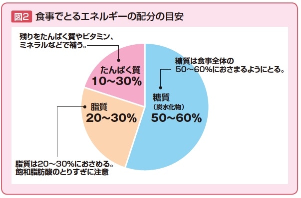 厚生労働省では、食事でとるエネルギーの配分の50〜60%を糖質(炭水化物)、20〜30%を脂質、10〜30%をたんぱく質にすることを推奨しています(図2)。実際の食材の例でみると図3のようなバランスになります。野本さんは「糖質源となる主食はごはんなら軽く1杯、主菜(たんぱく質)は肉や魚を手のひらサイズの大きさ、副菜は小鉢や汁もの1〜2杯分にすると概ね適切な比率になります。ただし、中性脂肪は糖質のとりすぎの影響が大きいので、主食や果物、おやつなどで糖質をとりすぎないよう、糖質の比率を少し控えめにするとよいでしょう」と説明します。