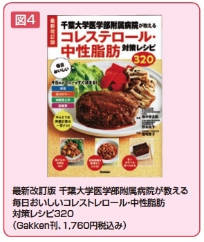 「紹介した食事のコツの全てを行おうとすると大変かもしれませんが、一つずつ取り入れてみてください。病院では食事のバランスを改善するための栄養指導をしています。より多くの患者さん一人一人の生活に合った多彩なレシピをお伝えするために、毎日の食事のレシピとともに食事療法のコツをまとめて出版しました(図4)」と言う野本さん。本書は千葉大学医学部附属病院長の横手幸太郎先生と野本さんの監修により、自炊、外食、コンビニ食など、さまざまな食事の場面をイメージしながら食事の改善を図れるようにしたのが特徴です。
