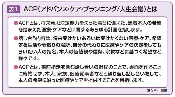 在宅医療の現場でACPに取り組む遠矢先生は「我々医療者が一番重要視するポイントは“ご本人がどうしたいか”ということです。老化や病気の進行で体調や心境も変化していきます。我々は、ご本人、ご家族、他の医療スタッフなどと繰り返し話し合いをして、最新のご希望を共有し、万が一の時に、患者さん本人の希望に沿った医療やケアを提供することを目指しています」と話します(表1参照)。