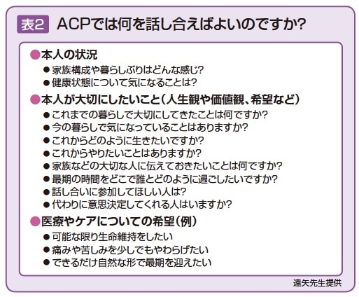 では、ACPにおいては具体的にどのようなことを話し合えばいいのでしょうか。遠矢先生が患者と家族向けに医療・介護スタッフらと「何を話し合うのか」をまとめたのが表2です。
