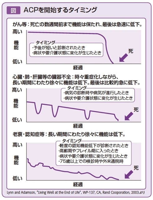 医療・介護スタッフらも交えたACPを開始する時期は、病気の種類や身体の状況などによって違ってきます。図は海外の研究者がACPを開始するタイミングについて考察したものです。