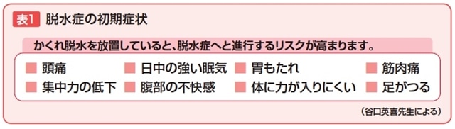 表2に挙げたようなサインがあったらかくれ脱水かもしれないので要注意です。谷口先生は「脱水のサインに気がついたらとにかく水分を補給してください。経口補水液やスポーツドリンクがあればなおよいですが、飲み水でもかまいません。脱水による身体の痛みは頭痛、筋肉痛、関節痛など部位を選ばずに痛くなるのが特徴です。37℃程度の微熱も脱水で起こります。こうしたかくれ脱水の症状の大半は水分の補給で解消します」と言います。