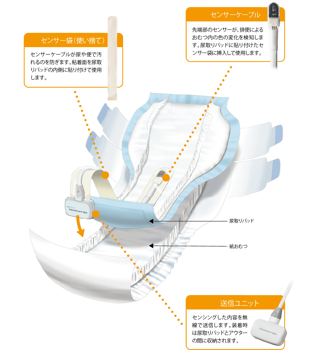 紙おむつに簡単装着。排便を検知して、スタッフに知らせます。