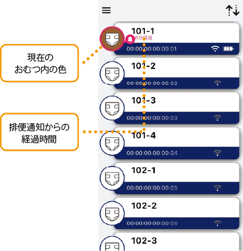 スマートフォンに通知するほか、画面に利用者ごとの排便状況と排便からの経過時間を一覧表示できます。また、過去の排便時刻の記録も確認できます。