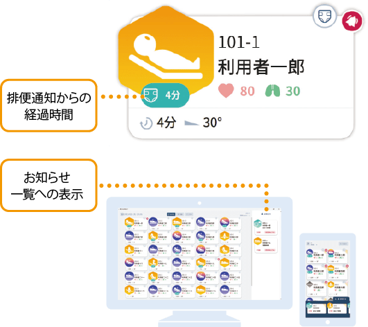 「眠りCONNECT」のリアルタイムモニター画面に様々な見守り情報とともに排便状況を表示します。スマートフォンへの通知や、排便時刻記録の確認もできます。