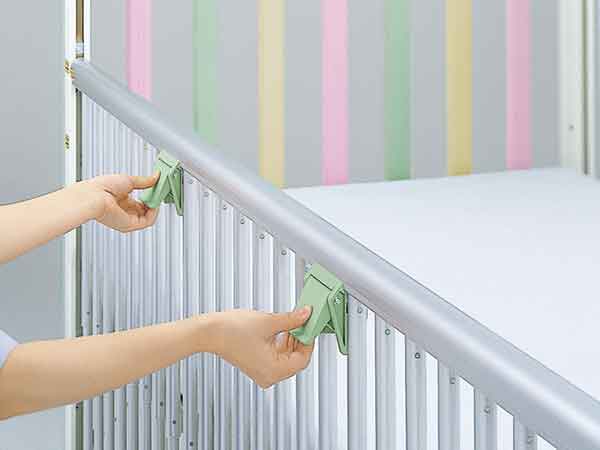 A double-lock lever and safety lock mechanism are adopted to prevent the child from falling over should he/she attempt to lower the slide-down side-rail by himself/herself. Even after being unlocked, the height of the side-rail can only be adjusted with both hands.Slide-down Side-rails Adjustable to 4 Different Heights