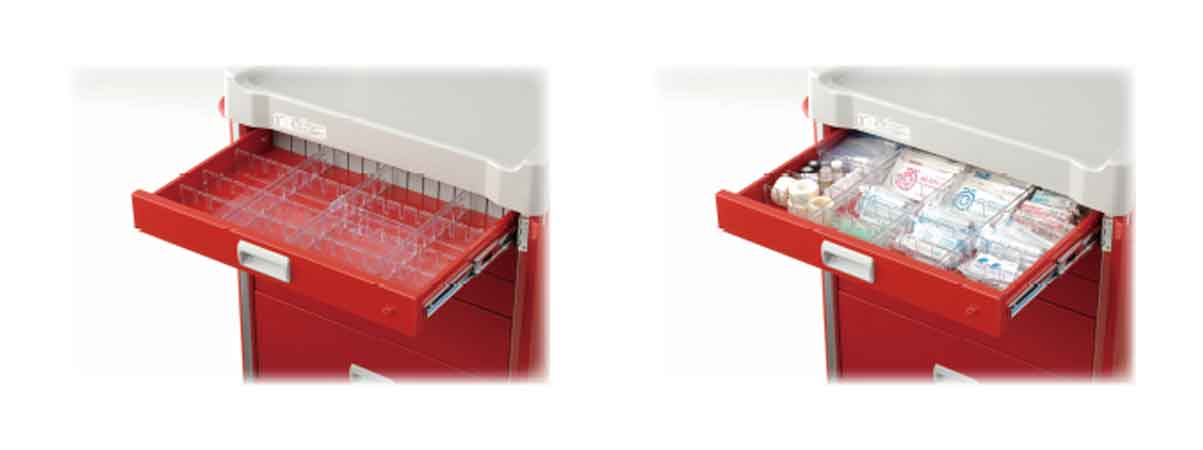 The drawers of the medical cart come in three different depth and sizes. Specially designed dividers in the drawers also allow for easy classification and management of medication and other diagnostic materials. The adjustable dividers help to keep things organized in a systematic way according to one's needs.Single Key Lock System